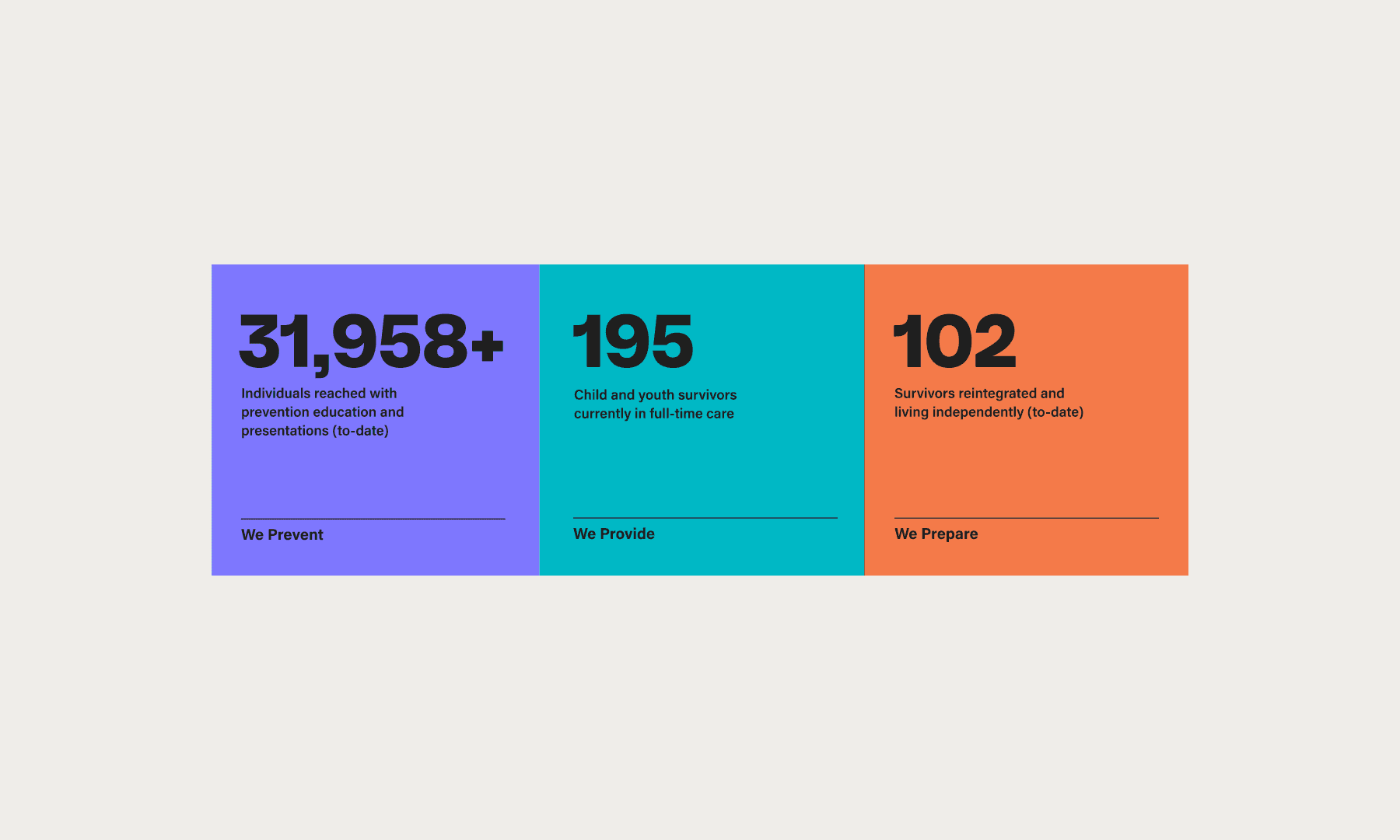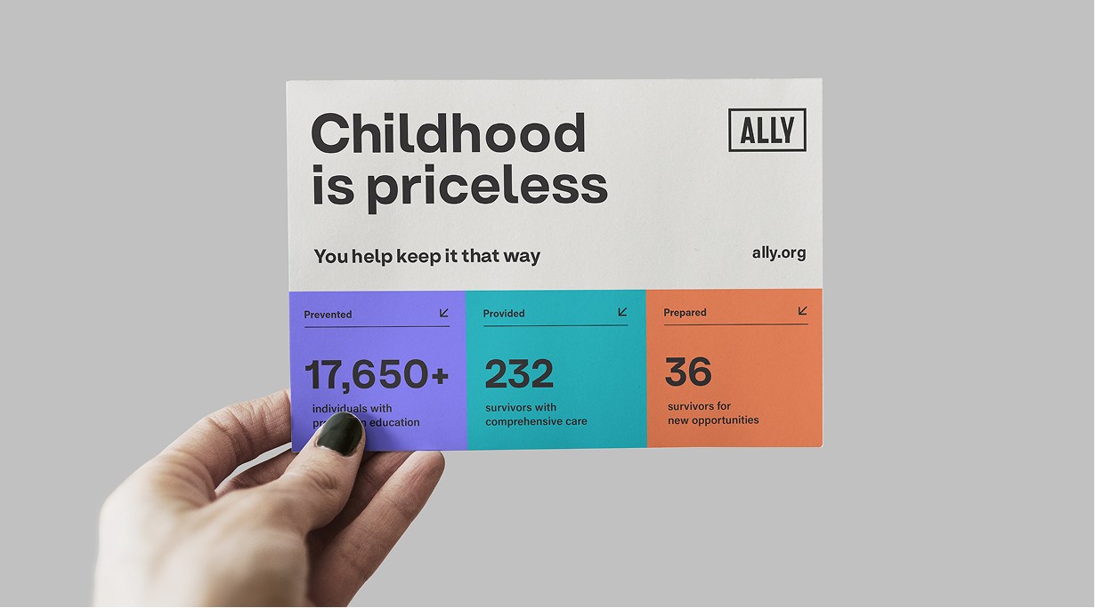 Together, aqua, purple, yellow, and orange support the organization’s three pillars — Prevent. Provide. Prepare.