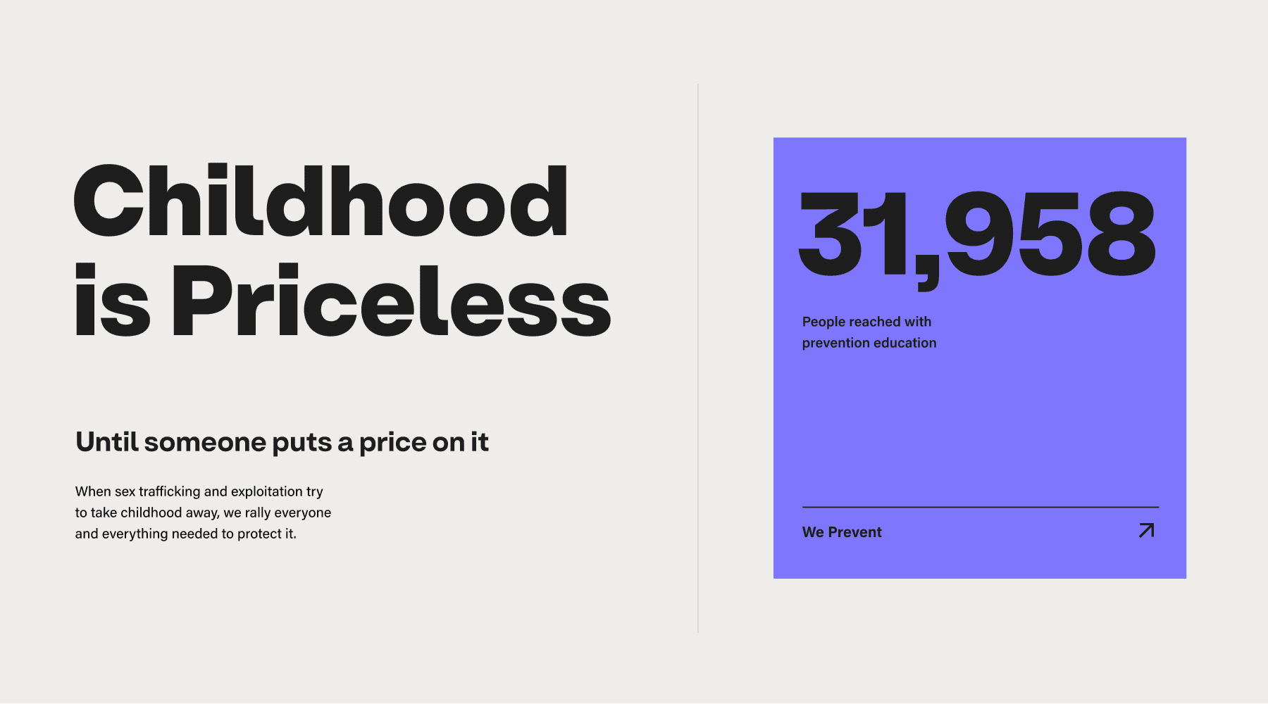 Under Veto’s repositioning strategy, the organization expanded from emphasizing individual restoration projects to communicating a comprehensive model — addressing prevention, intervention, restoration, and reintegration in the fight against child sex trafficking and exploitation .