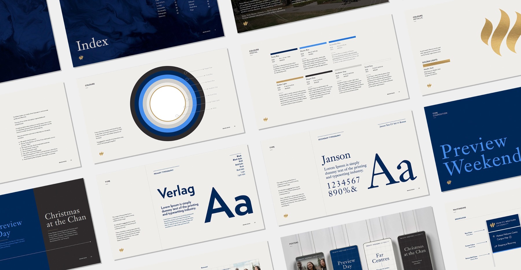 A disciplined colour hierarchy anchored in Trinity Blue and Golden Lights created institutional authority, while secondary tones allowed flexibility across audiences and applications .